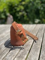 Devonshire , Oak-Bark tanned,  Bridle Butt leather ; Solid brass buckle and D-Ring hand stitched into place with waxed linen thread ; Brass rivets for extra strength ; embossed Hawkmoth , flanked by 2 more solid brass Rivets .